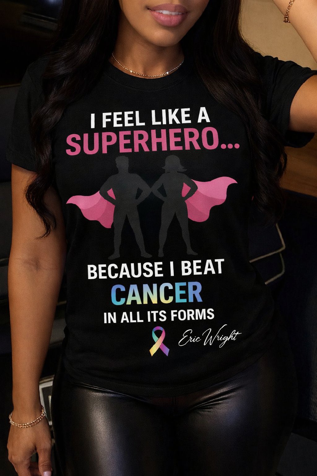 Designed with bold lettering, symbolic superhero silhouettes, and a multi-color cancer awareness ribbon, this shirt speaks for every survivor — across all forms of cancer.